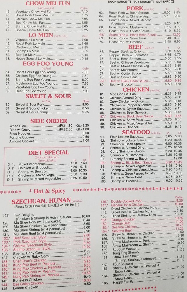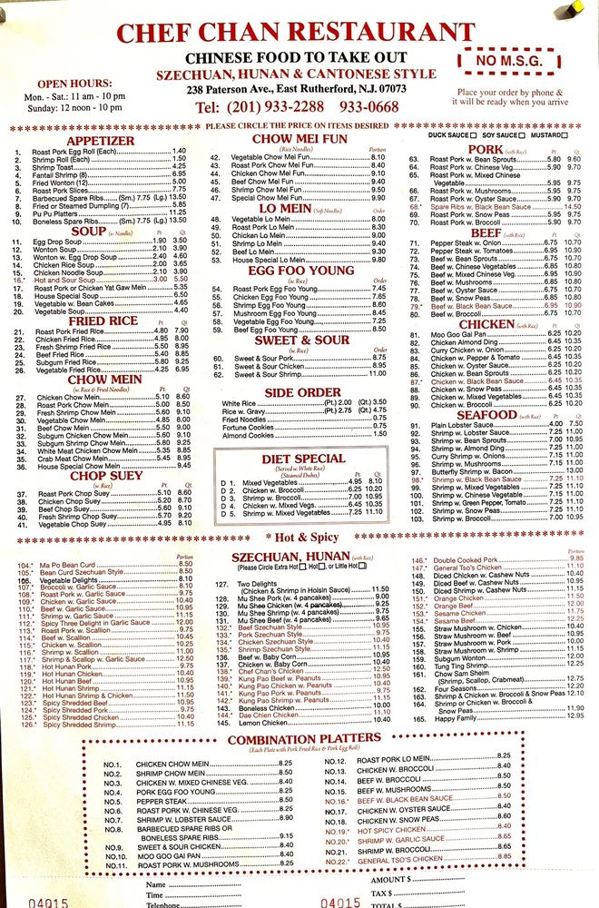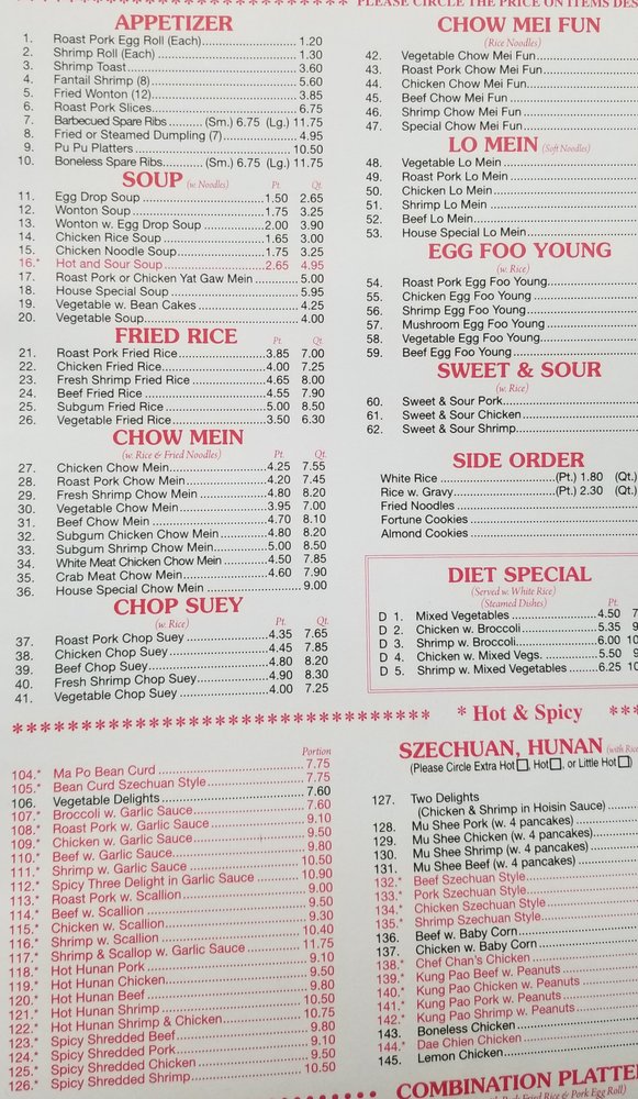 Introducing the menu at Chef Chan Restaurant, a delightful Chinese dining spot located at 238 Paterson Ave, East Rutherford, NJ. This unclaimed eatery specializes in flavorful and well-prepared Chinese cuisine, perfect for takeout or a casual dining experience. Guests rave about the boneless rib combo, chicken Mei Fun, and General Tso's chicken, noting the quality and generous portions that set it apart from typical takeout options.